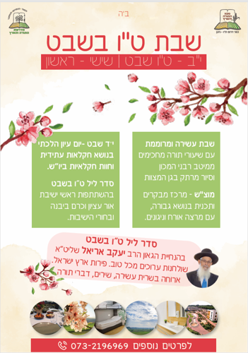 This uplifting and enriching Shabbat will be spent together with the rabbis of the Torah VeHa’aretz Institute and will include a Motzei Shabbat program, participation in the Tu BiShevat conference, and the Tu BiShevat Seder that evening.